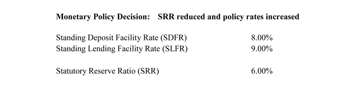 The Monetary Board of the Central Bank, at its meeting held on 13 November 2018, decided to reduce the Statutory Reserve Ratio (SRR) applicable on all rupee deposit liabilities of commercial banks by 1.50 percentage points to 6.00 per cent. In order to neutralise the impact of this reduction and maintain its neutral monetary policy stance, the Monetary Board decided to increase the Standing Deposit Facility Rate (SDFR) of the Central Bank by 75 basis points to 8.00 per cent and the Standing Lending Facility Rate (SLFR) of the Central Bank by 50 basis points to 9.00 per cent. The Board arrived at this decision following a careful analysis of current and expected developments in the domestic and global economy and the domestic financial market, with the broad aim of stabilising inflation at mid single digit levels in the medium term to enable the economy to reach its potential.